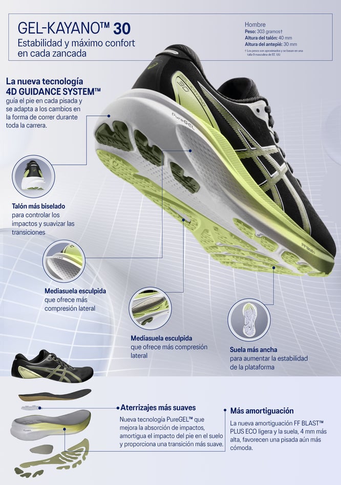 Además el GEL- KAYANO™ 30 permite un aterrizaje más suave que absorbe los impactos por la tecnología PureGEL™ , también con más amortiguación gracias al FF BLAST™ PLUS ECO y el aumento de 4 mm en la suela que da energía de rebote en cada pisada.